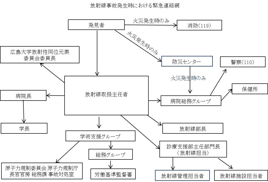 第5条 規程第32条第1項,第33条第1項及び第34条第1項に定める連絡通報体制は放射線事故発生時における緊急連絡網(別表)に従い,報告しなければならない。