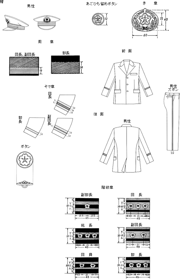 階級章 | 団長 | 長さ45ミリメートル、幅30ミリメートルの黒色の台地とし、上下両側に3ミリメートルの金色平織線、中央に18ミリメートルの金色平織線及び径12ミリメートルの金色消防団き章3箇を付け、右胸部に付ける。 | |